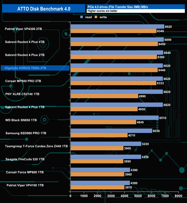 Gigabyte rate the Sequential read/write performance of the 2TB 7000s as up to 7,000MB/s and 6,850MB/s respectively. Using the ATTO benchmark we couldn't quite hit those maximums, the tested drive producing a read figure of 6,820MB/s with writes at 6,440 MB/s.