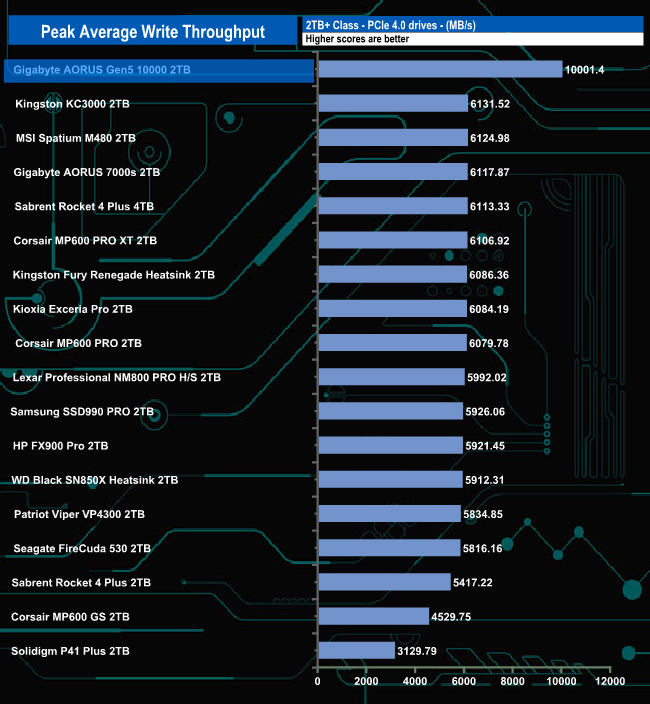 Even though that peak read result of 7,611MB/s is nowhere near the official maximum figure. it's still good to enough to place the drive in top spot in our results chart by some distance.