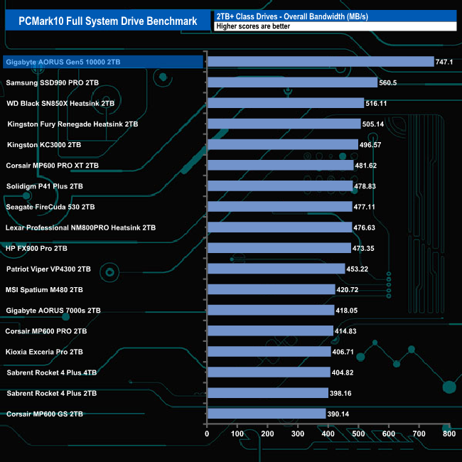 The overall bandwidth figure of 747.1MB/s sees the drive sitting in top spot in the results chart.