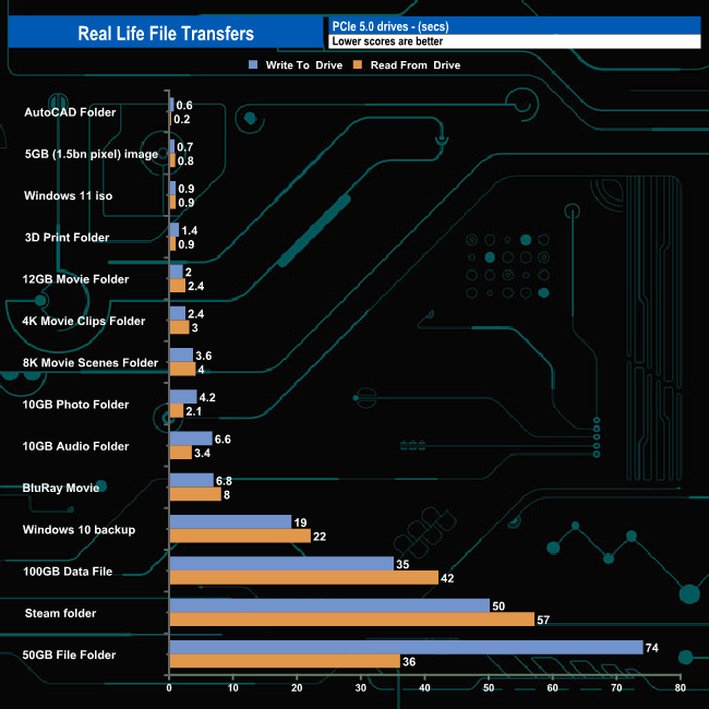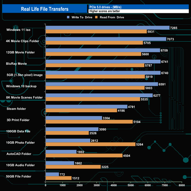 The drive averaged 4,673MB/s when writing the 18 transfer tests, with the fastest being the 7,265MB/s for the Windows 11 iso transfer and the slowest being the 50GB file folder transfer at 772MB/s. Reading back the data the average was a bit faster at 4,750MB/s. Once again the crown for the fastest transfer went to the Windows 11 iso. The slowest transfer was again the 50GB file folder at 1,512MB/s.