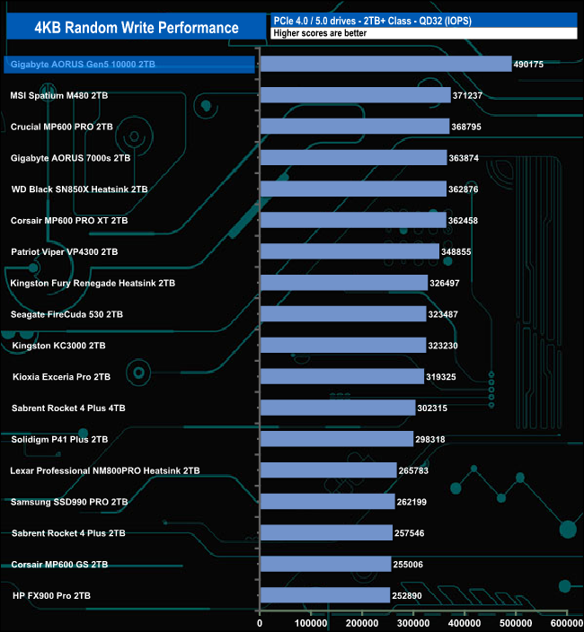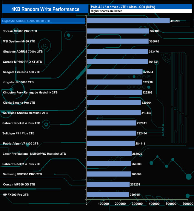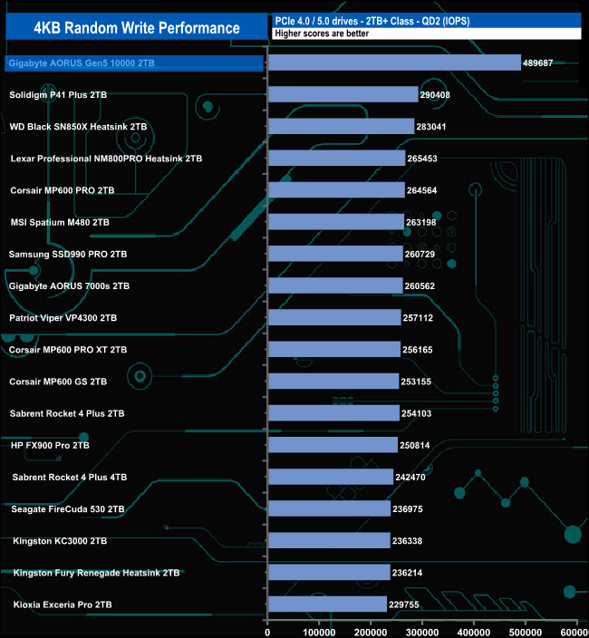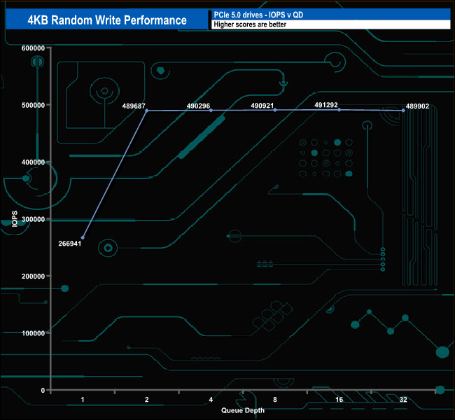 As with the random read performance, the random write test results are nowhere near the official maximum figure of 2,000K IOPS in our four-threaded testing. The drive's performance is pretty consistent from QDs 2 to 32 with the peak result of 491,292 IOPS coming at the QD16 mark. Even though our test results couldn't get anywhere near the official figure, the drive still ranks as the fastest consumer NVMe drive we've seen to date.
