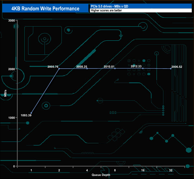 We used CrystalDiskMark 8‘s custom settings to test the 4K random write performance of the drive through a range of queue depths. The setup for the tests is listed below.