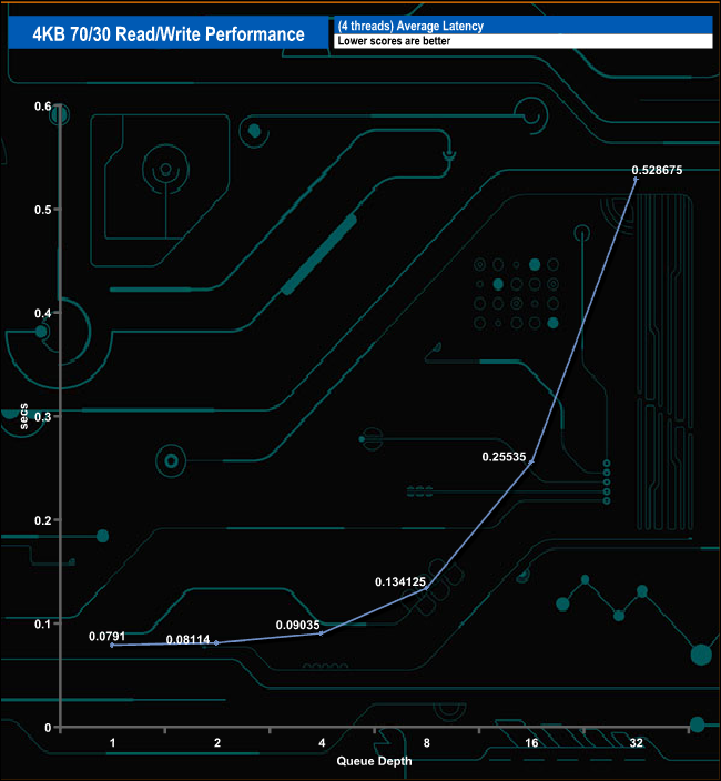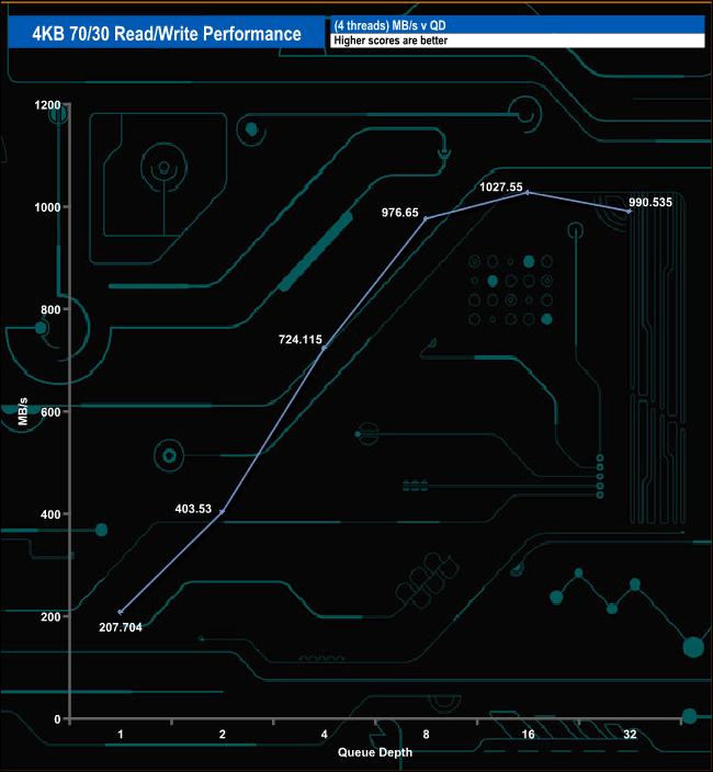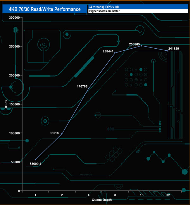 In the 4K 70/30 read/write mix test, the drive peaks at QD16 with a figure of 250,865 IOPS (1027.55MB/s) before dropping back to finish the test run at 241,829 IOPS (990.535MB/s).