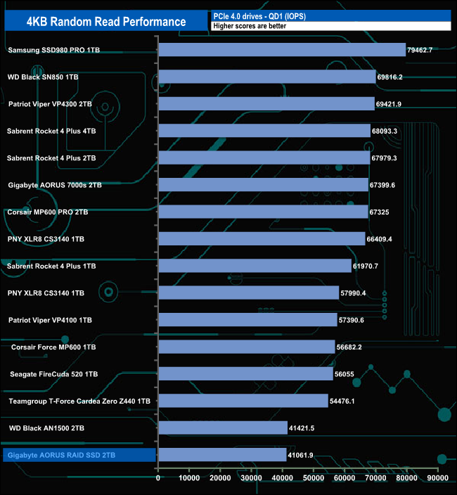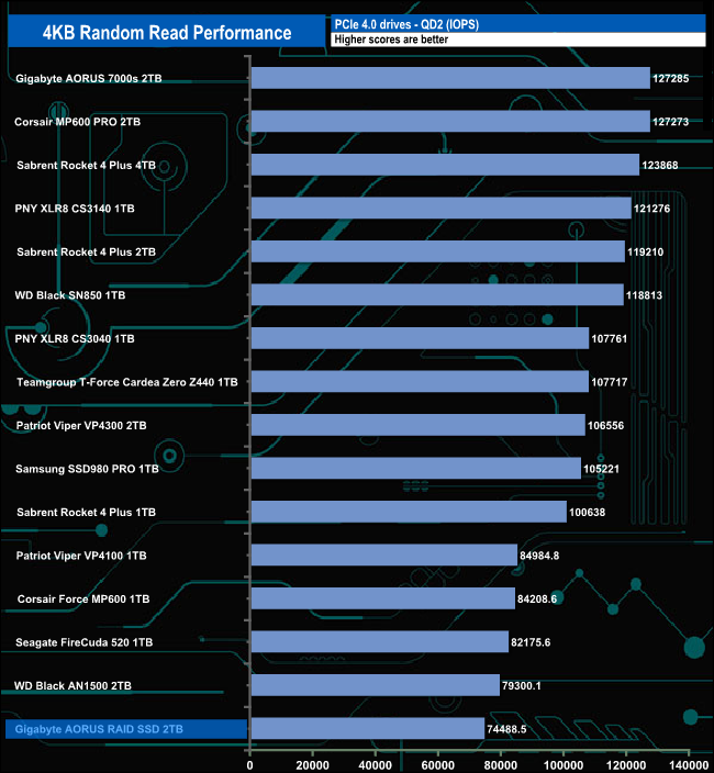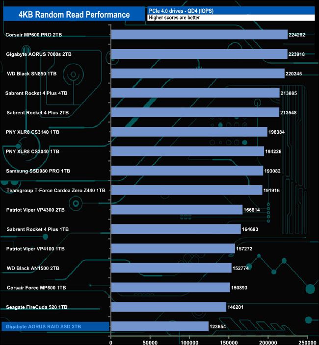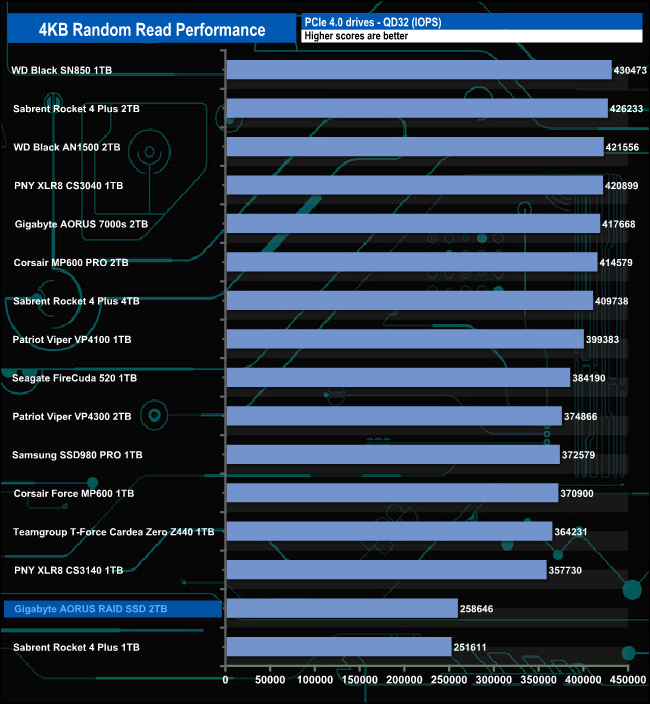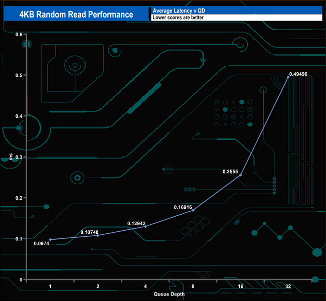 The drive is no match for the PCIe Gen4 drives when it comes to random read performance, although having said that it is slightly faster than the 1TB version of Sabrent's Rocket 4 Plus at a QD of 32.