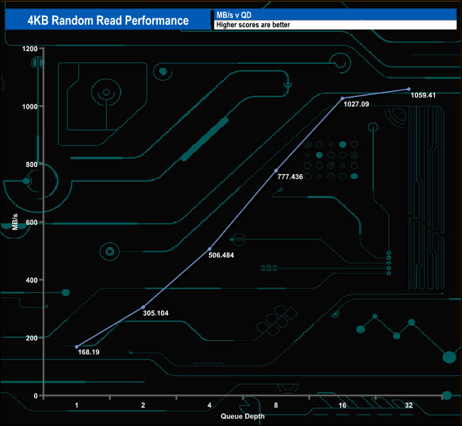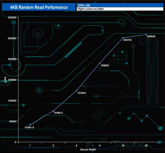 In our 4-threaded 4K random read test, the drive's performance rose steadily as the queue depth deepened but the rate of increase did seem to slow down from QD16. The best performance we saw from the drive was 258,753 IOPS at a QD of 32.