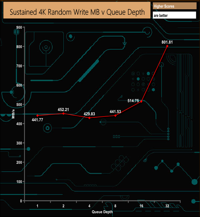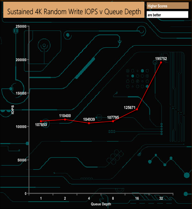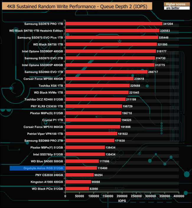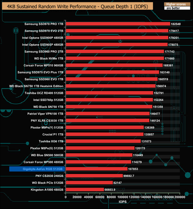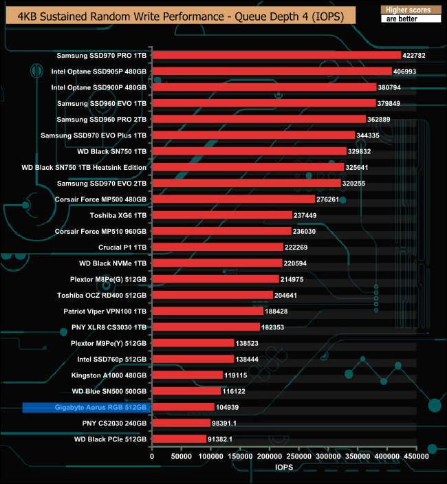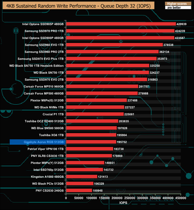 Gigabyte quote a random 4K write performance figure for the drive as up to 440,000 IOPS. We couldn't get close to that with our QD4 tests, the fastest IOPS figure we saw was 195,752 IOPS.