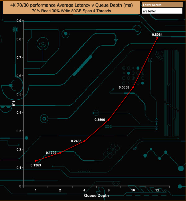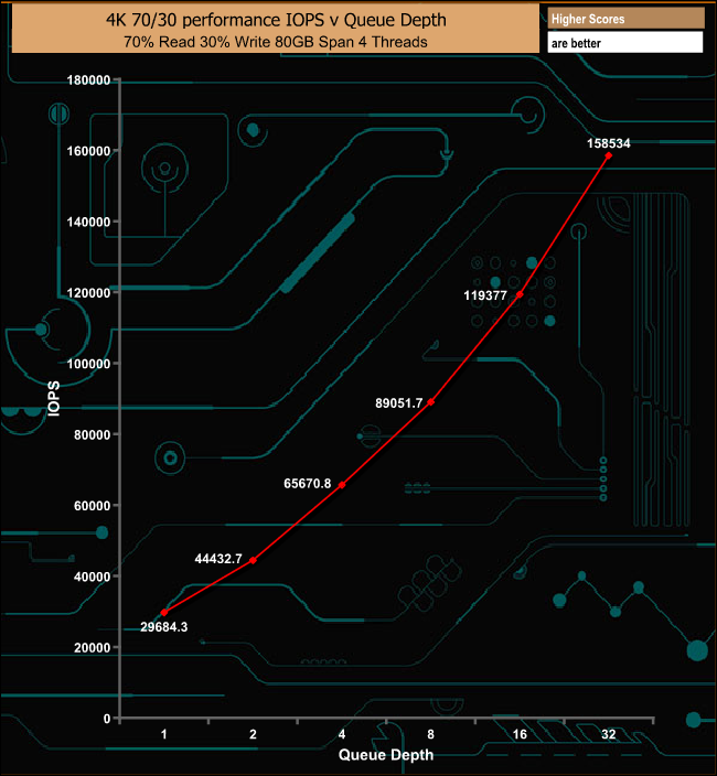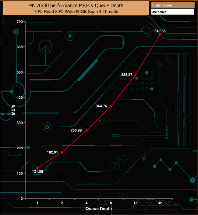 In our mixed read/write test, the Aorus RGB performs reasonably well, producing a nice smooth performance curve with the deepening queue depth.