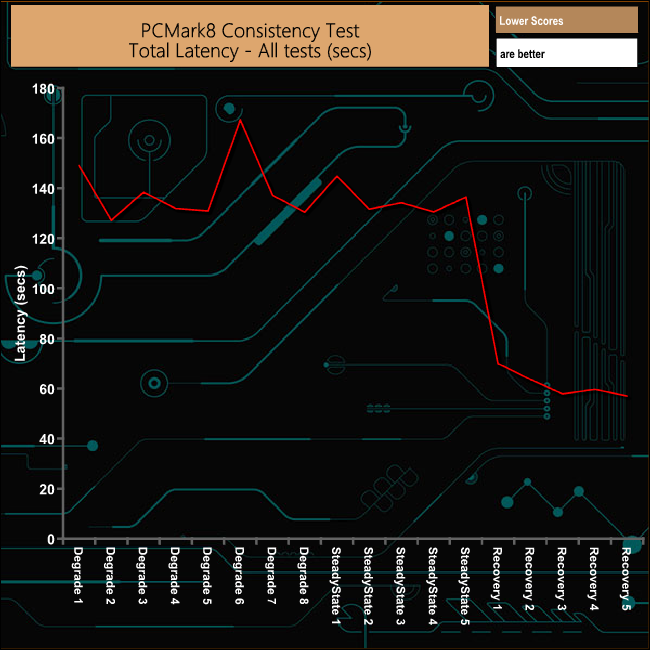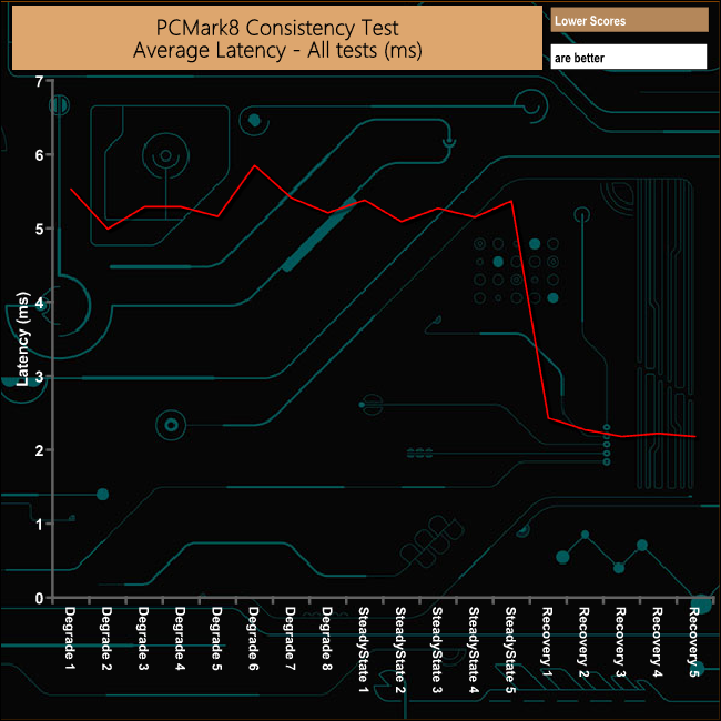 Overall the Aorus RGB drive handles the rigours of PCMark 8's Consistency Test very well, although there is a noticeable drop in bandwidth during the sixth Degradation run. The drives performance during the recovery phases is excellent.