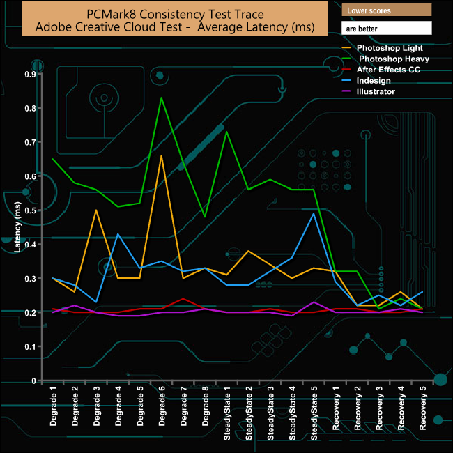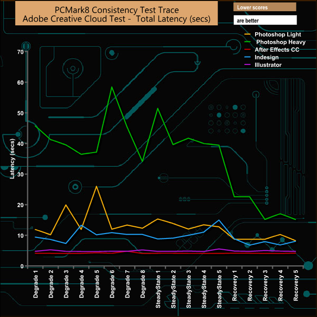 PCMark 8’s Consistency test provides a huge amount of performance data, so here we’ve looked a little closer at how the 512GB Gigabyte Aorus RGB performs in each of the benchmarks test suites.