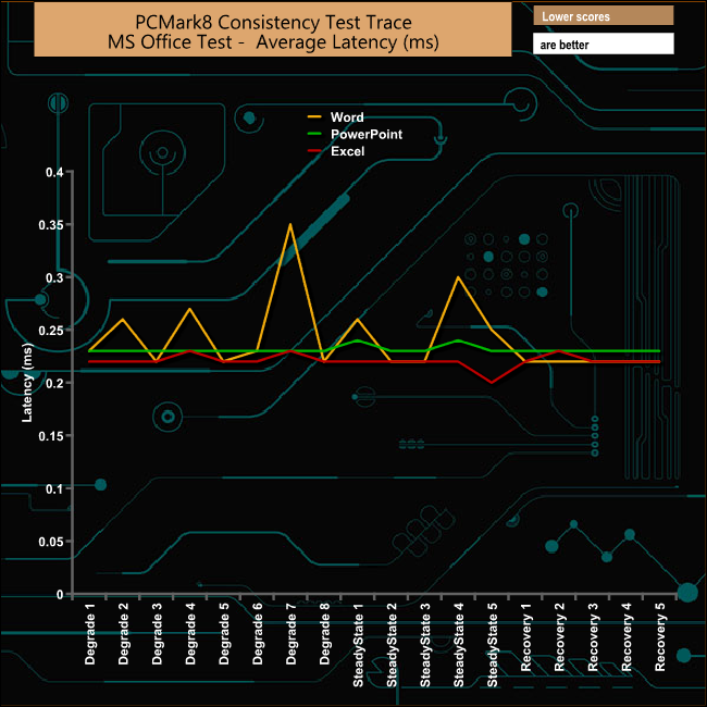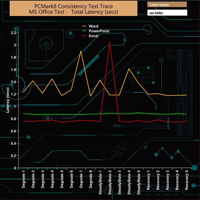 The Microsoft Word trace causes the drive a whole host of problems during the test run but the Excel trace suffers a huge bandwidth drop during the second Steady State phase. The drives recovery is steady without being spectacular.