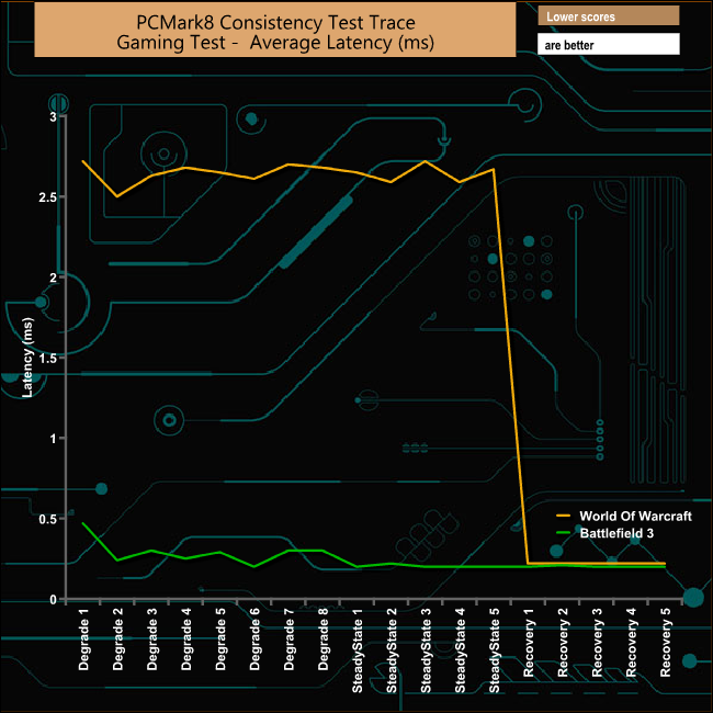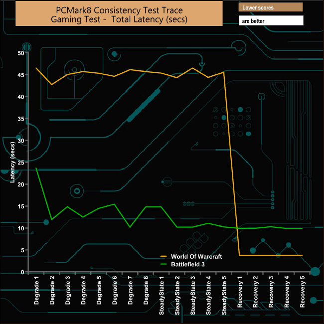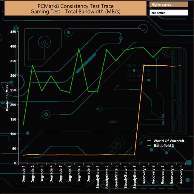 There's a huge difference between the two casual gaming tests. The Battlefield 3 trace causes the drive problems but with pretty good bandwidth figures, whereas the World Of Warcraft test displays very few problems apart from the very low overall bandwidth during the Degradation and Steady State phases. However the recovery performance of the trace is spectacular.