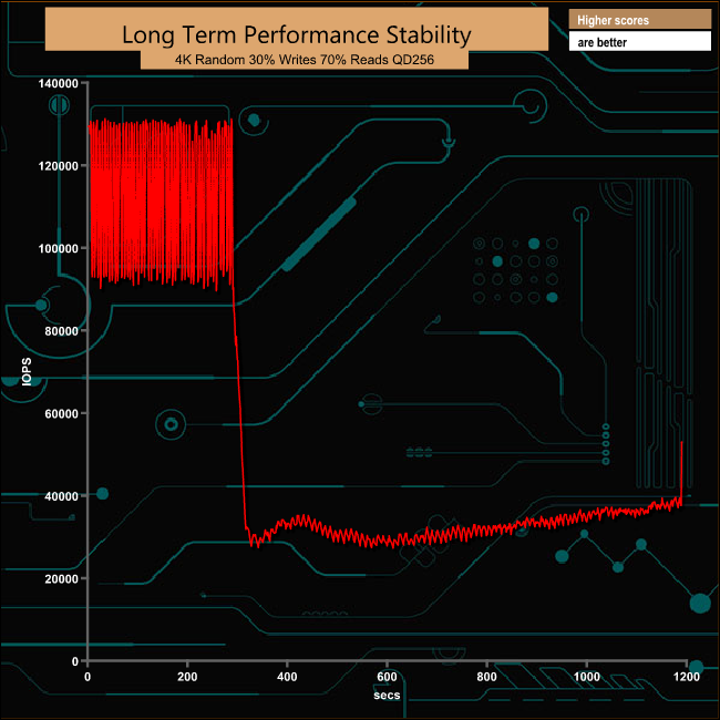 For the long term performance stability test, we set the drive up to run a 20-minute 4K random test with a 30% write, 70% read split, at a Queue Depth of 256 over the entire disk. The 512GB Aorus RGB averaged 52,950 IOPS for the test with a performance stability of 40.54%.