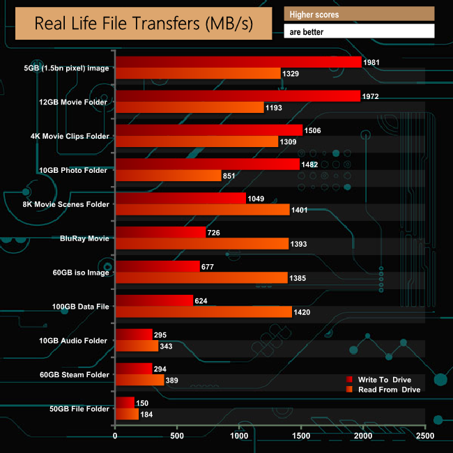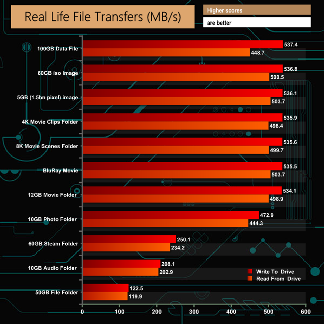 Taking the SATA drive out of the loop, the drive shows some excellent performance when dealing with the large files in the 4K movie and 12GB Movie folders and the 5GB photo.