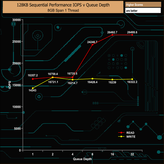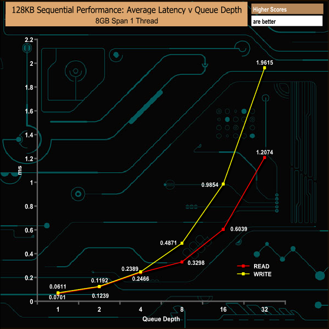 The Sequential write performance of the drive remains pretty consistent through the tested queue depths.