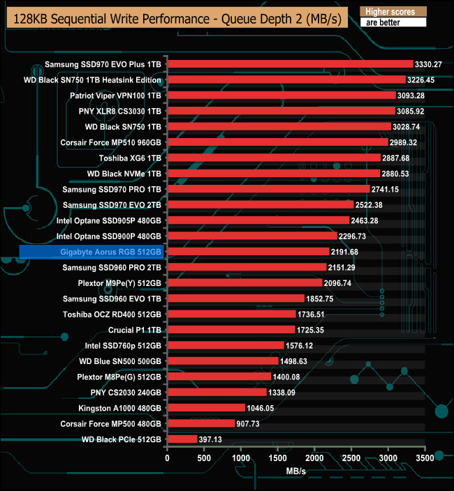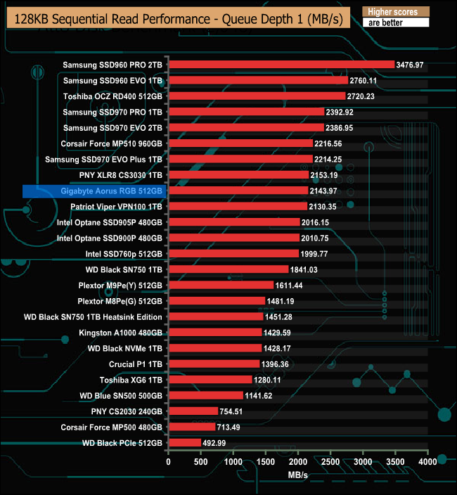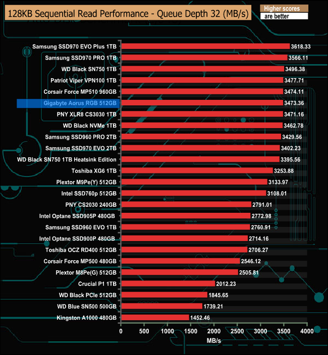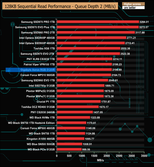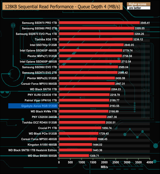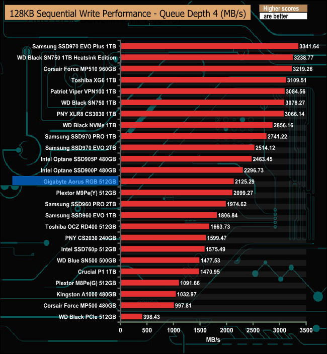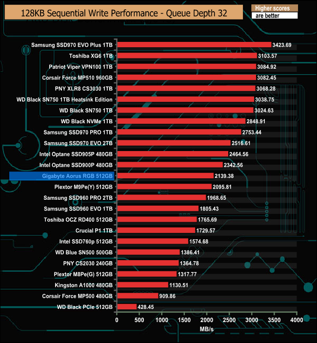 The Aorus RGB's Sequential read performance remains strong through queue depths 1 and 2 before dropping off a little at QD4. The QD32 performance is very strong.