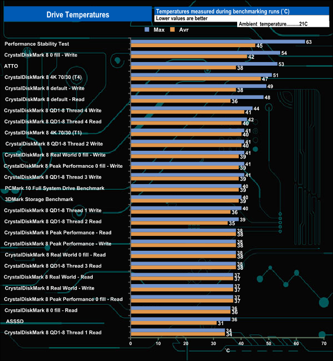 We took note of the drive’s temperature during some of our benchmarking runs. The HP FX900 Pro uses a thin thermal pad which employs graphene foam in its construction. The hottest the drive got was when it was being pushed extremely hard during the Performance Stability test when it peaked at 63° C, perilously close to the maximum operating temperature of 70° C. However for the bulk of our testing the temperature averaged around 40° C, comfortably below the maximum operating temperature