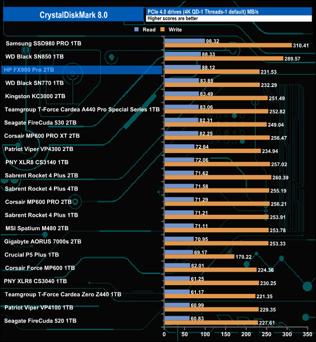 Using the default CrystalBenchMark 8 4K QD1 T-1 benchmark the FX900 Pro's result figure of 88.12MB/s for reads is good enough to sit the drive in the third spot in our results chart. The write result of 231.53MB/s isn't as strong in comparison with many of its competitors.