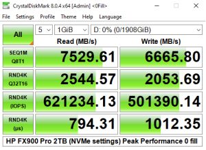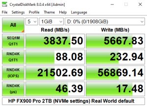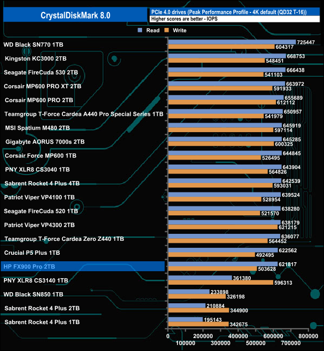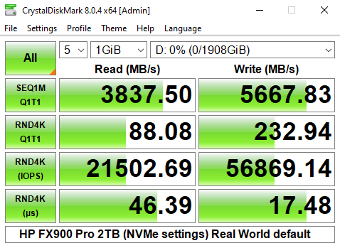 The 4K test results are nowhere near as impressive with both reads and writes falling well short of the official figures. The 2TB FX900 Pro is rated up to 1344 K IOPS for reads and 1122 K IOPS for writes. The best read result we saw in CrystalDiskMark was 621,817 IOPS for reads and 503,628 IOPS for writes.