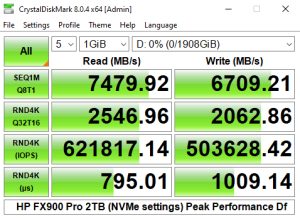 Looking at the benchmark result screens we could confirm the official read/write maximums of 7,400MB/s and 6,700MB/s with test results of 7,523MB/s and 6,705MB/s for reads and writes respectively. That tested read score of 7,523MB/s makes the FX900 Pro the fastest consumer Gen4 drive we've seen to date, although the write performance isn't as strong.
