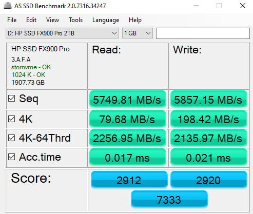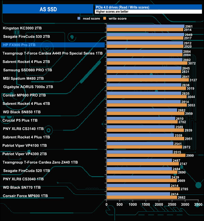 Using the more demanding AS-SSD benchmark sees the drive producing a read score of 2912, good enough to place the drive in third spot in our result chart. The write score of 2920 is decent but not as good as some of the drives in this chart.