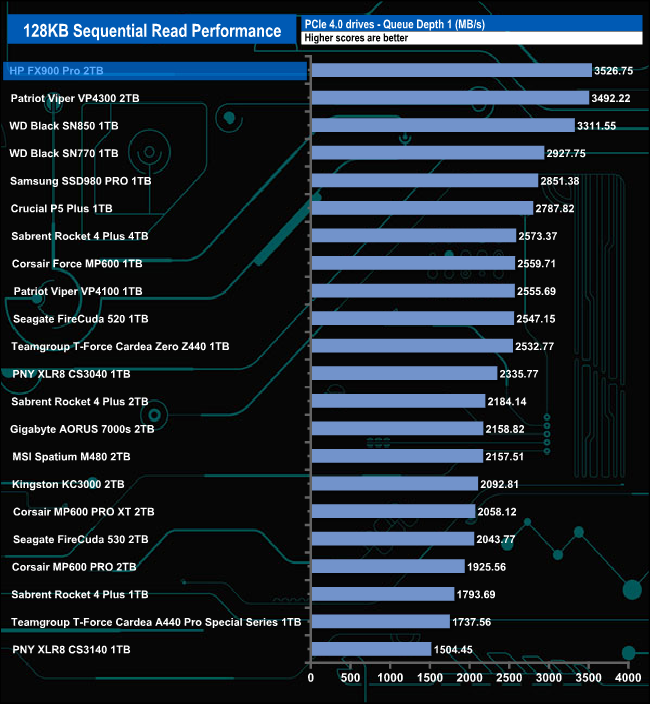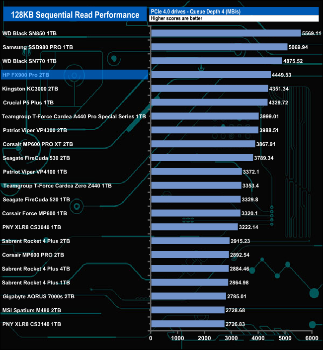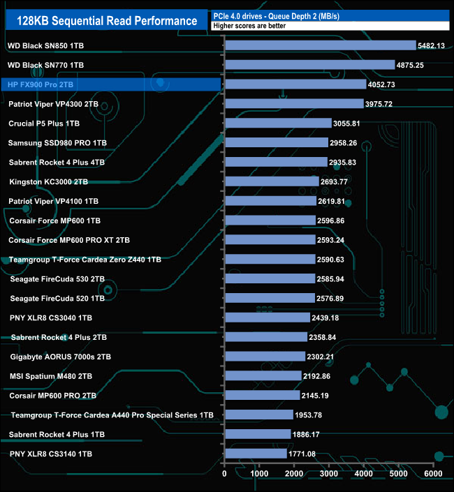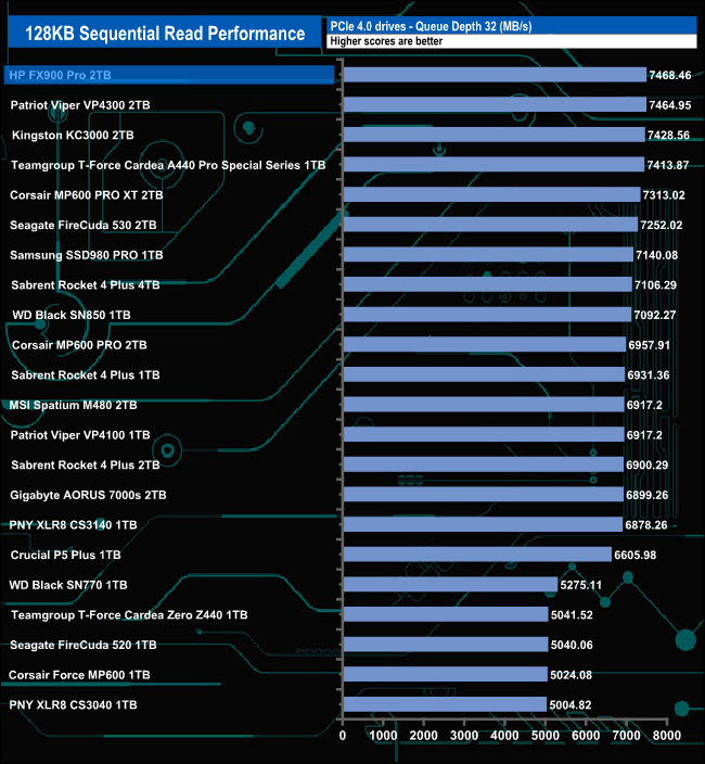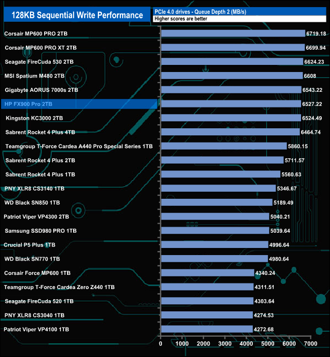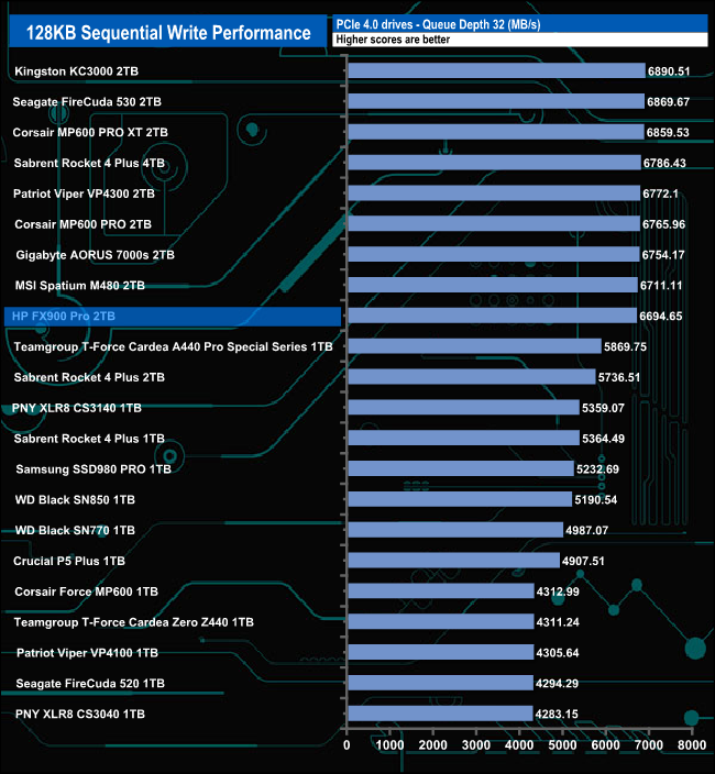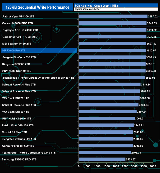 The 2TB HP FX900 Pro is the fastest consumer drive we've seen to date for Sequential reads at QD1 (3,526MB/s). At QD's 2 & 4 it drops to third and fourth place respectively before topping the table again at QD32 with a test result of 7,468.46MB/s.