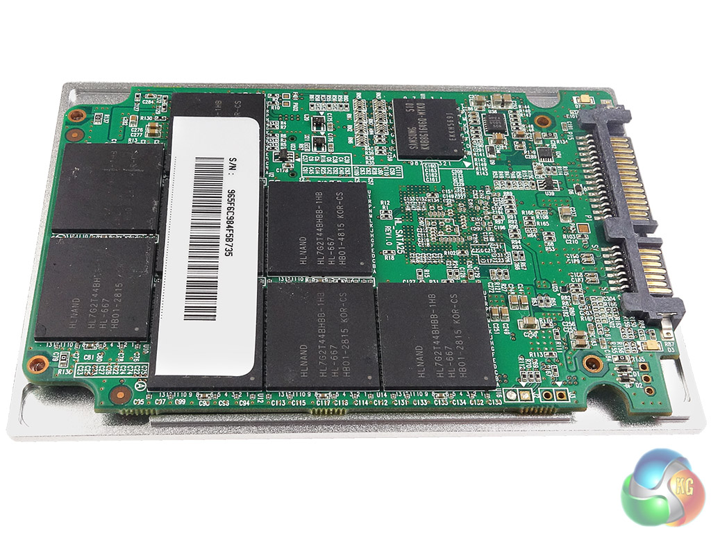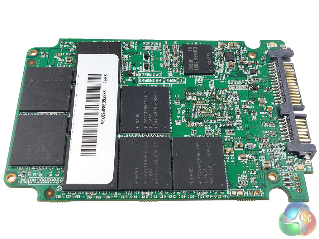Each HLNAND package is made up of 16 dies of 128Gbit MLC NAND giving a total of 256GB per package. Also on the same side of the PCB as the controller are three power capacitors to protect against power loss.