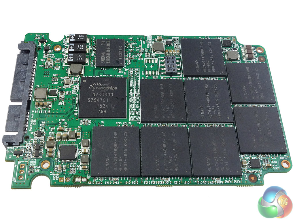 Once opened you are faced by a full-length PCB holding eight 256GB HLNAND packages (labelled HL7G2T44BHBB-1HB) and a single Samsung DDR3-1600 cache chip. The reverse of the board holds another eight 256GB HLNAND packages, the Novachips NVS3800-39 controller and another Samsung DDR3-1600 cache IC.