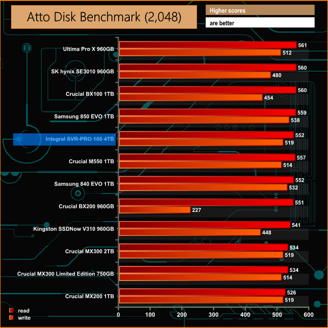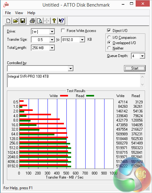 The official Sequential performance figures for the SVR-PRO 100 SRI 4TB are up to 551MB/s for reads and up to 517MB/s for writes. These numbers proved to be bang on the money when the drive was tested with the ATTO benchmark.
