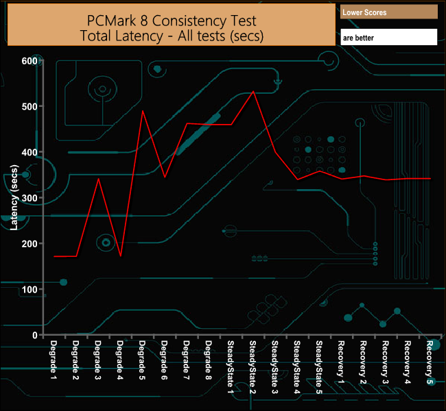 The drive didn't handle PCM8 Consistency test too well with high latency results throughout the final parts of the degradation tests and when in a steady state. It didn't recover too well from the ordeal either.