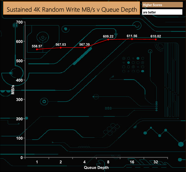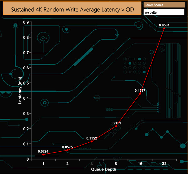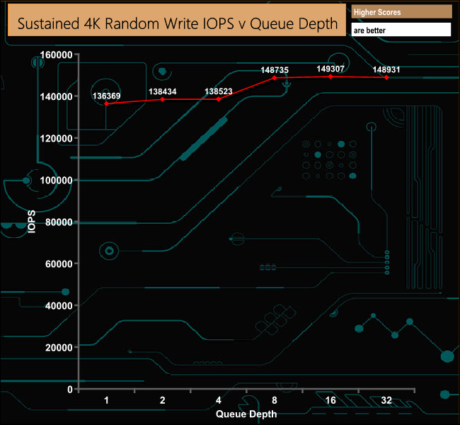 Unlike the Random read performance, there's not much movement in the 4K Random write performance as the queue depth deepens. It's pretty constant between QD1 and QD4 with a slight rise between QD4 and QD8 before it settles down again.