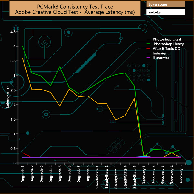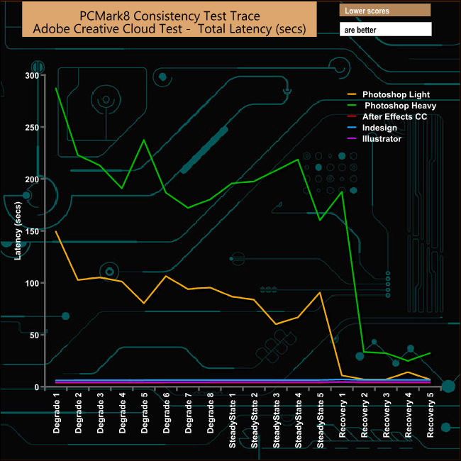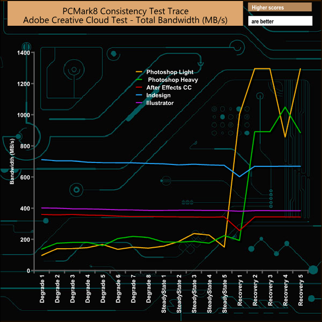 The drive deals with the two toughest aspects of the Adobe CC tests, the Photoshop Light and Heavy traces reasonably well. The recovery performance is very good although there is a real dip in performance with the Photoshop Light trace in the penultimate recovery run. The After Effects CC, InDesign and Illustrator traces are dealt with in an extremely efficient manner.