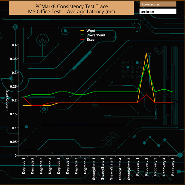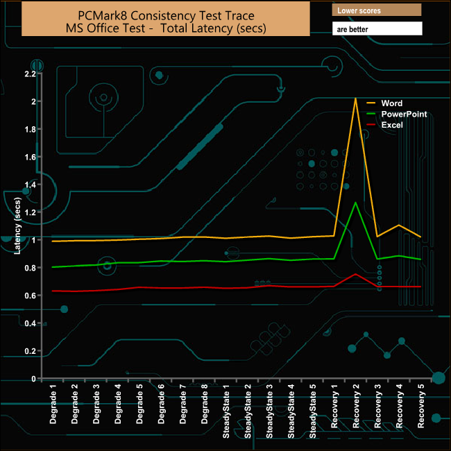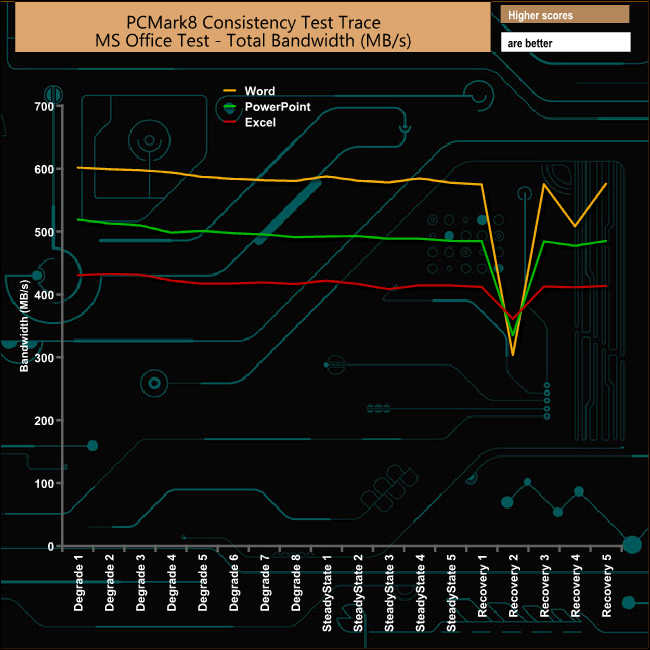 All three elements of the MS Office test deal with the stresses of the test very well indeed until the 2nd Recovery phase when all three take a hit in performance, the worst effected being the Word test which drops by 271MB/s. The PowerPoint trace drops by 149MB/s while the Excel trace just drops 50MB/s. However all three recover very well from this performance drop.