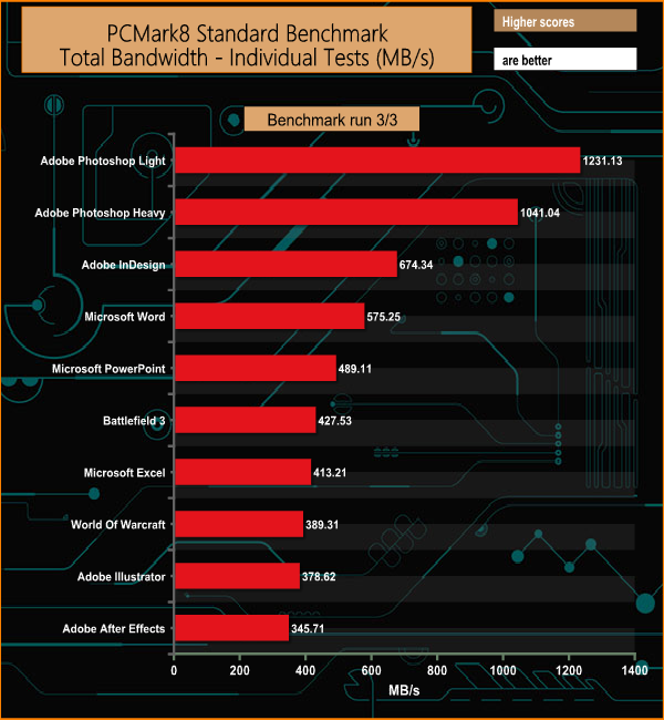 Just like the Consistency test, PCMark 8’s standard Storage test also saves a large amount of performance data. The default test runs through the test suite of 10 applications three times. Here we show the total bandwidth performance for each of the individual test suites for the third and final benchmark run.