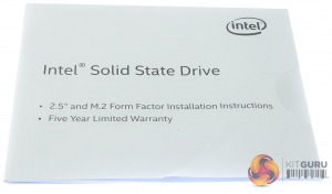 To the right of the label is a diagram showing the format of the drive under which sits a URL for Intel's SSD webpage and the fact that the drive comes with a five year warranty.