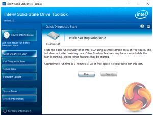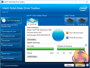 Intel Toolbox SSD management utility is a pretty comprehensive tool for looking after your SSD. The home screen displays information about the drive, how the capacity is being used, its health and estimated life remaining.