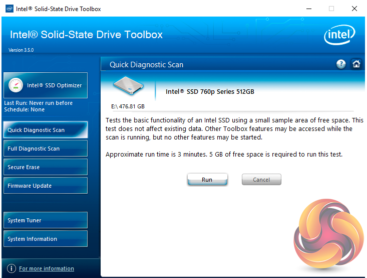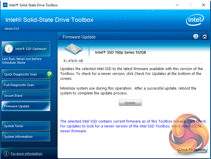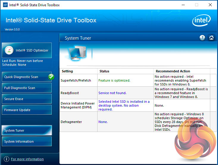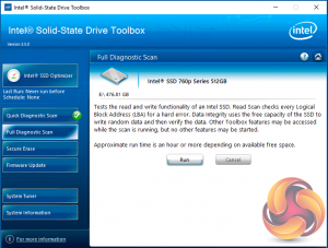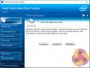 There are seven buttons on the right hand side of the utility main screen. These are for Intel's SSD Optimizer, two drive diagnostic scans, one quick the other full, secure erase, firmware updates, a system tuner and a page for system information.