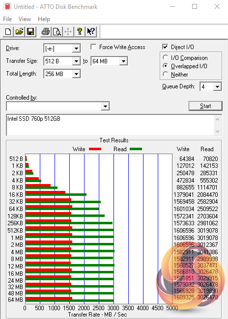Intel's official Sequential read/write figures for the 512GB SSD760p are up to 3,230MB/s and 1,625MB/s respectively. Using the ATTO benchmark we couldn't quite reach the maximum read figure, the tested drive giving a score of 3,048MB/s. Writes however were bang on the official figure at 1,620 MB/s.