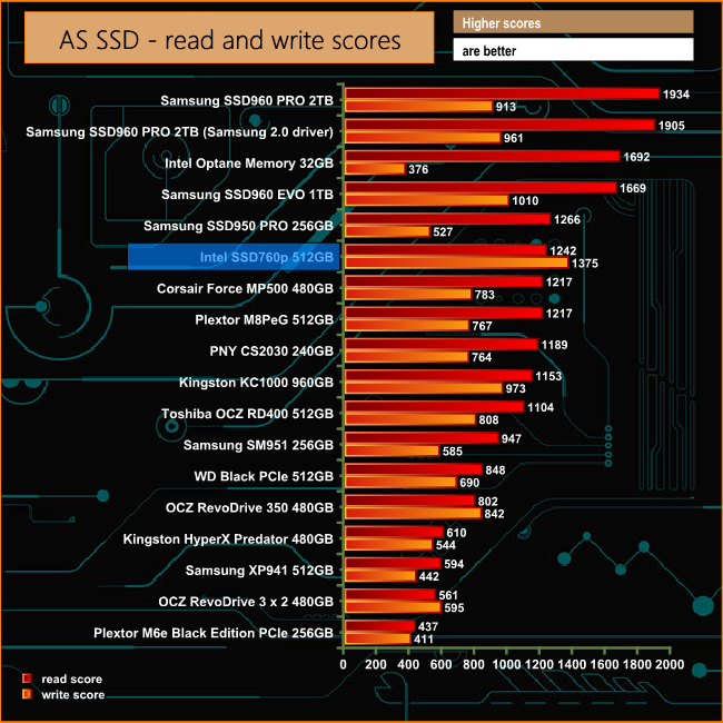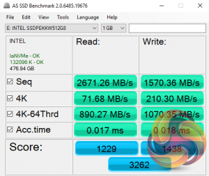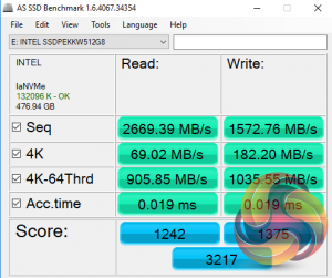 The drive didn't fare so well in the much more stringent AS-SSD benchmark when it came to reads producing a score 1242. Write performance on the other hand was very good, giving a score of 1375, the highest we have seen to date in this benchmark from a M.2 drive.