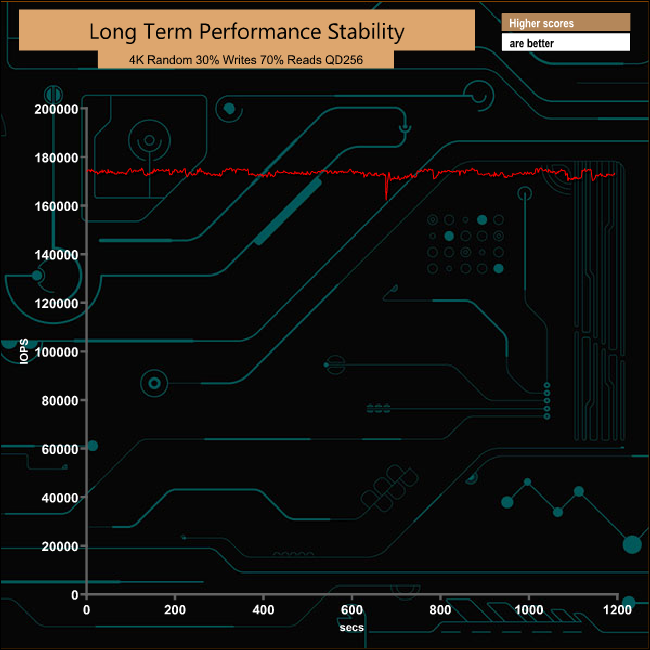 For the long term performance stability test, we set the drive up to run a 20-minute 4K random test with a 30% write, 70% read split, at a Queue Depth of 256 over the entire disk. The 750GB Optane DC P4800X averaged 173,382 IOPS for the test with a performance stability of 98.87%, or 99% if you prefer, which is the stability figure you should expect from a dedicated enterprise drive.