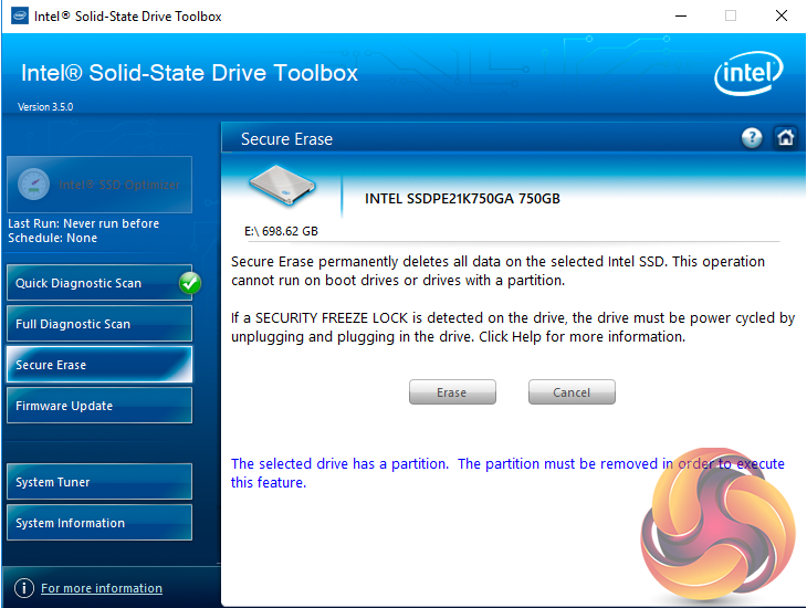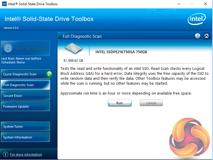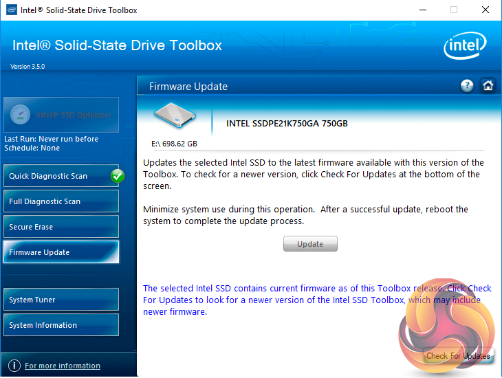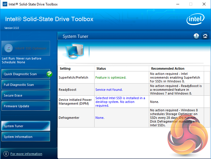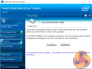 There are seven buttons on the right hand side of the utility main screen. These are for Intel’s SSD Optimiser, two drive diagnostic scans – one quick and the other full – secure erase, firmware updates, a system tuner and a page for system information.