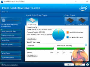 The Intel Toolbox SSD management utility is a pretty comprehensive tool for looking after your SSD. The home screen displays information about the drive, how the capacity is being used, its health and estimated life remaining.