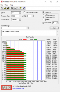 The official Sequential performance figures Intel gives for the drive are up to 2,500MB/s for reads and 2,200MB/s for writes. Both of these figures we could confirm using the ATTO benchmark, with a tested read figure of 2,572MB/s and 2,236MB/s for writes.