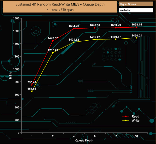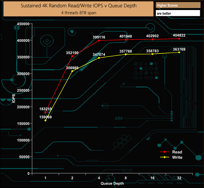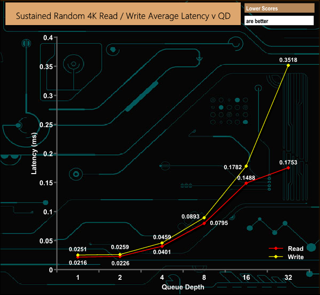 Intel's 3D XPoint memory technology has been designed to offer very quick performance at low queue depths and at low latencies. This can be seen in action by the 4K Random results – both reads and writes rocket away in queue depths 1-4 and then plateau out.