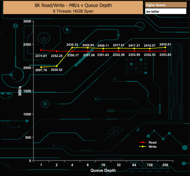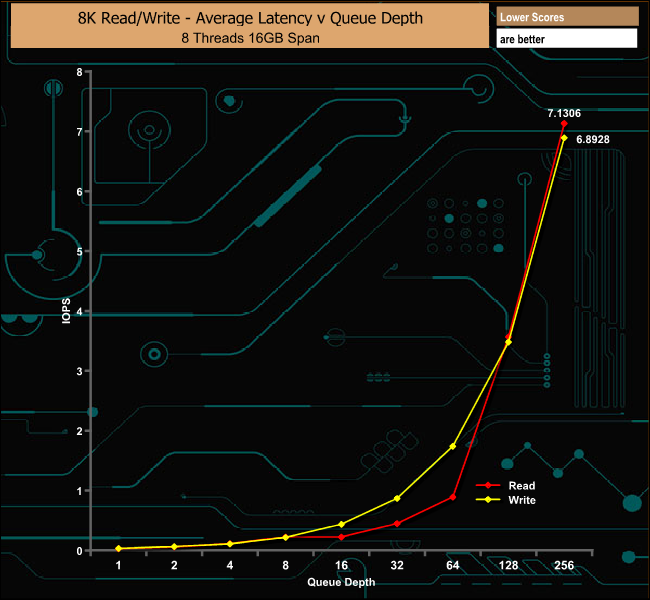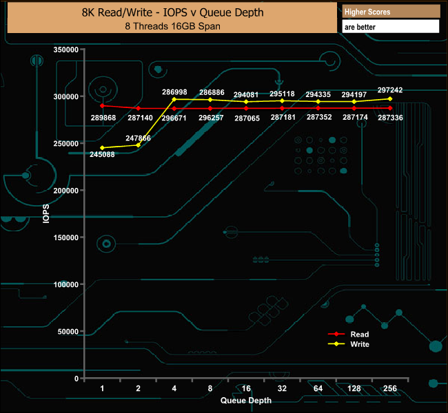 Testing the random performance at 8K, which is more akin to the data centre environment that the drive has been designed for, sees much consistent read performance from the off. The write performance starts behind the reads but soon catches up and surpasses it, before once again settling down in a consistent pattern until right at the end of the test where the performance rises a little.