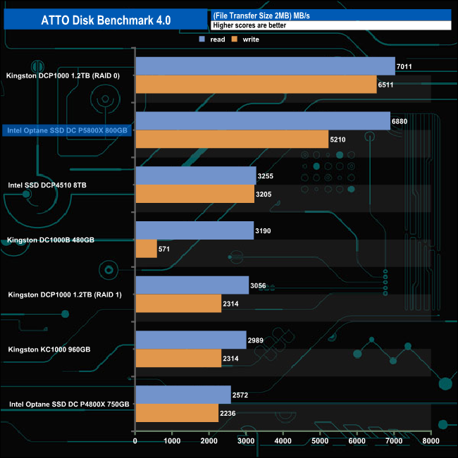 Intel rates the Sequential performance of the Optane DC P5800X as up to 7,200MB/s for reads and up to 6,100MB/s for writes. Using the ATTO benchmark (2MB transfer size) we couldn't quite reach those maximums, the test runs producing a best read figure of 6,880MB/s with writes at 5,210MB/s. Both of those figures absolutely trounces the previous DC P4800X drives figures of 2,572MB/s and 2,236MB/s for reads and writes respectively.