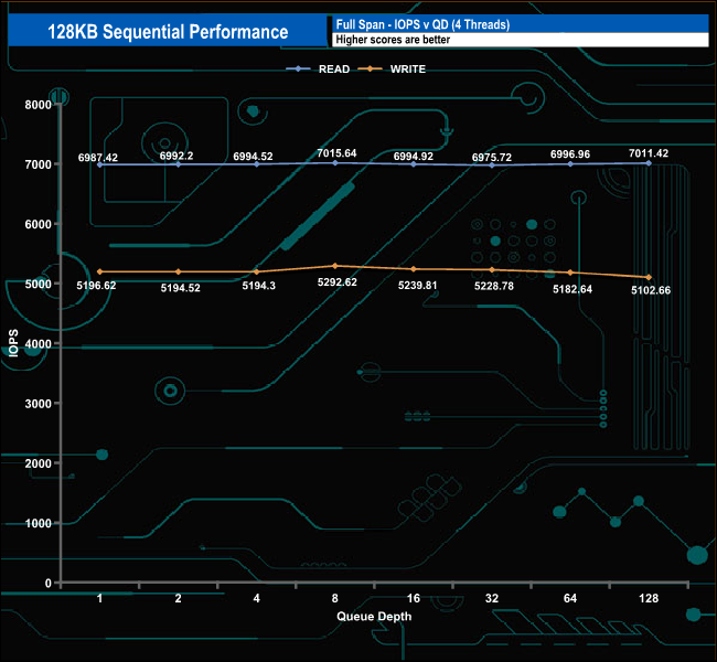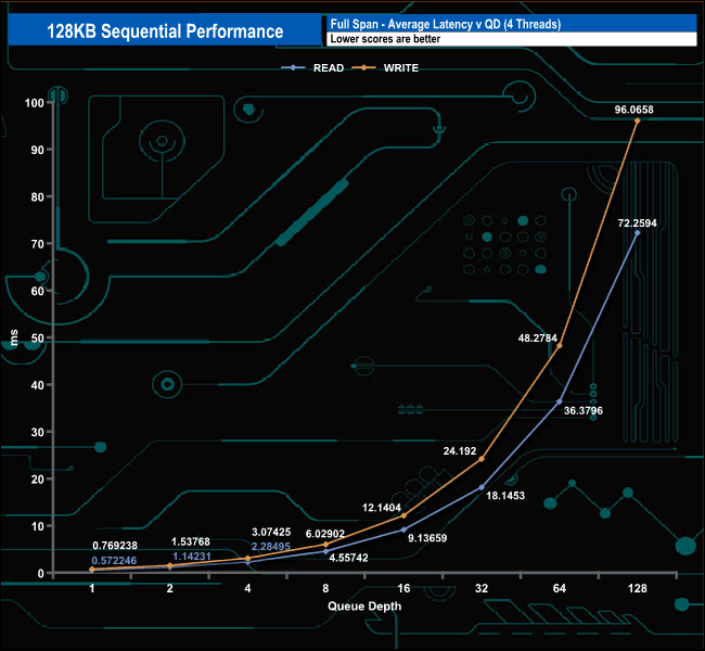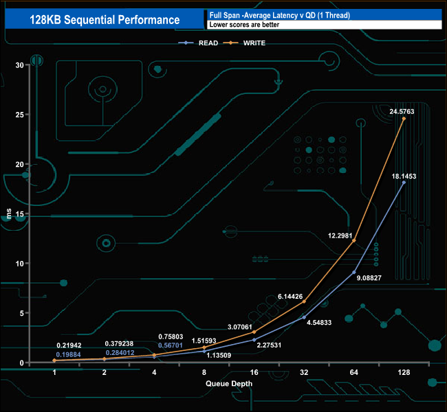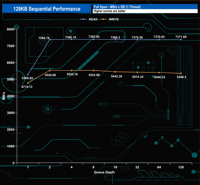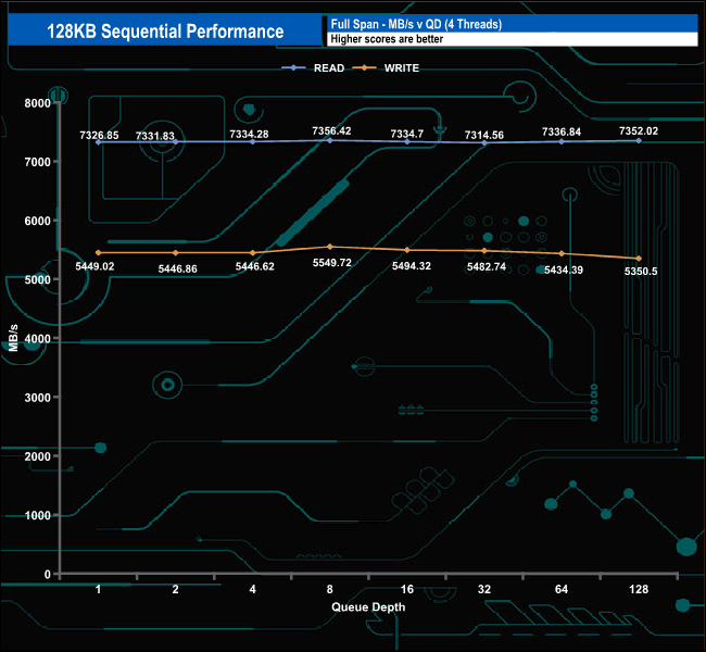 Using four threads the drive peaked at 7,356.42MB/s for reads and 5,549.72MB/s both at QD8. More importantly, using 4 four threads at QD1 sees the read performance rise from 5,268.83MB/s with a single thread up to 7,326.85MB/s. Similarly, the write performance at QD1 rises from 4,774.13MB/s to 5,449.02MB/s. It's also worth noting how constant the drive is across the tested queue depths.