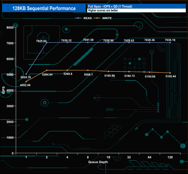 Intel rate the Optane DC P5800X as up to 7,200MB/s for reads and up to 6,100MB/s for writes. Using a single thread the drive peaked at 7,383.62MB/s at QD8 confirming the official read figure, before dropping back very slightly to finish the test run at 7,371.69MB/s (QD128). Writes peaked at QD4 at 5,269.8MB/s, some way short of the official figure.