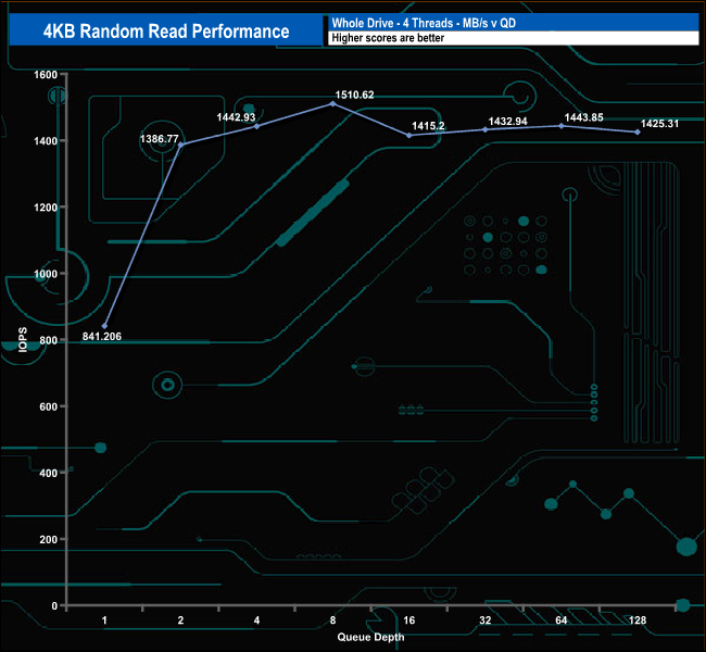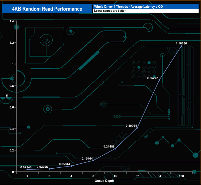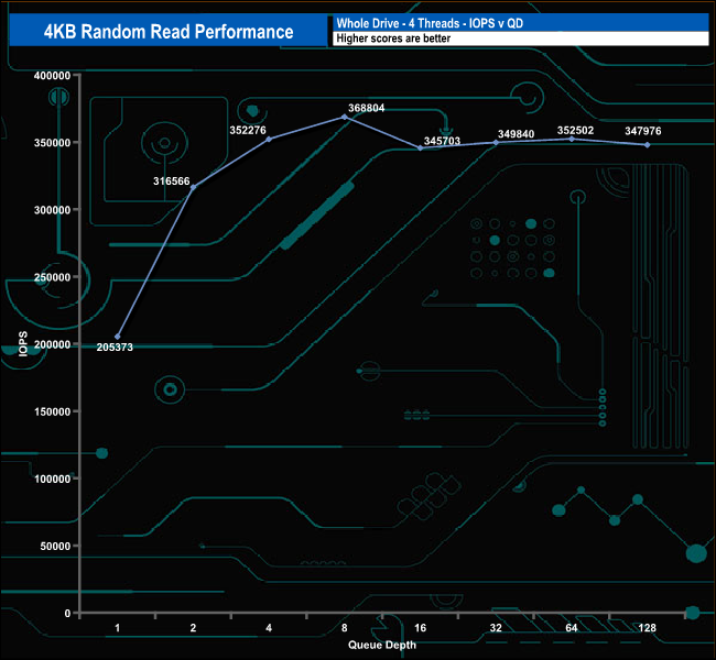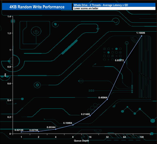 As with the random read testing, when it came to random writes we couldn't get close to the official maximum of 1,350,000 IOPS. The best we got from our four-threaded testing was 312,670 IOPS at QD32. Again the QD1 figure of 184,698 IOPS is very impressive.