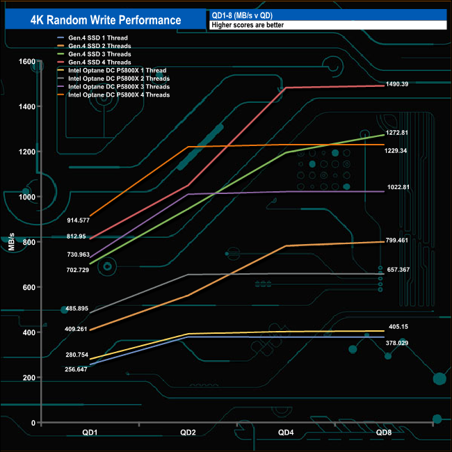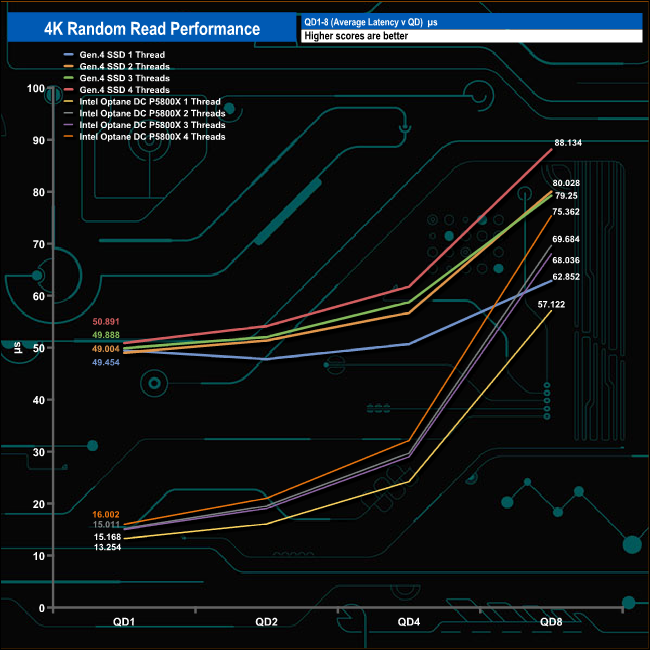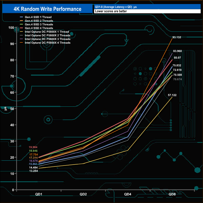 To give an idea of how powerful Intel’s 3D XPoint memory technology is at low queue depths for random read performance, here we show the Optane DC P5800X up against a fast Gen4 NVMe desktop drive, in this case, Corsair's 2TB MP600 PRO XT. At QD1 the Corsair drive is running at 20,176 IOPS, the DC P5800X is over twice as fast at 74,875 IOPS both using a single thread. However, at QD8 both drives are running at around the same rate, with the exception of the three threaded performance where the Intel drive still has the edge. Also, note the huge difference in the latency figures at QD1.