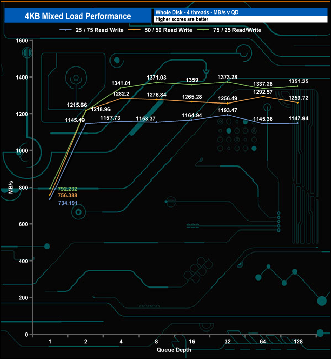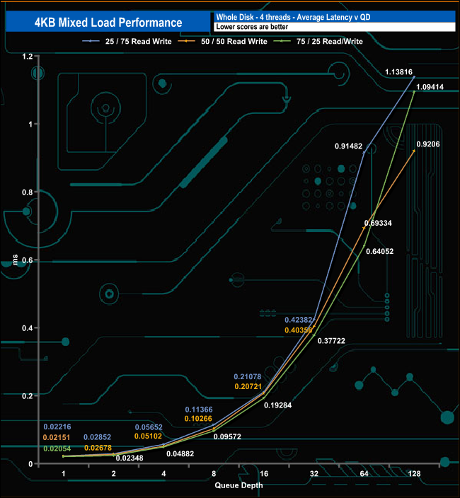 The drive handled our mixed load tests without any problems, showing once again the advantage of the low queue depth performance of the drives Optane technology.